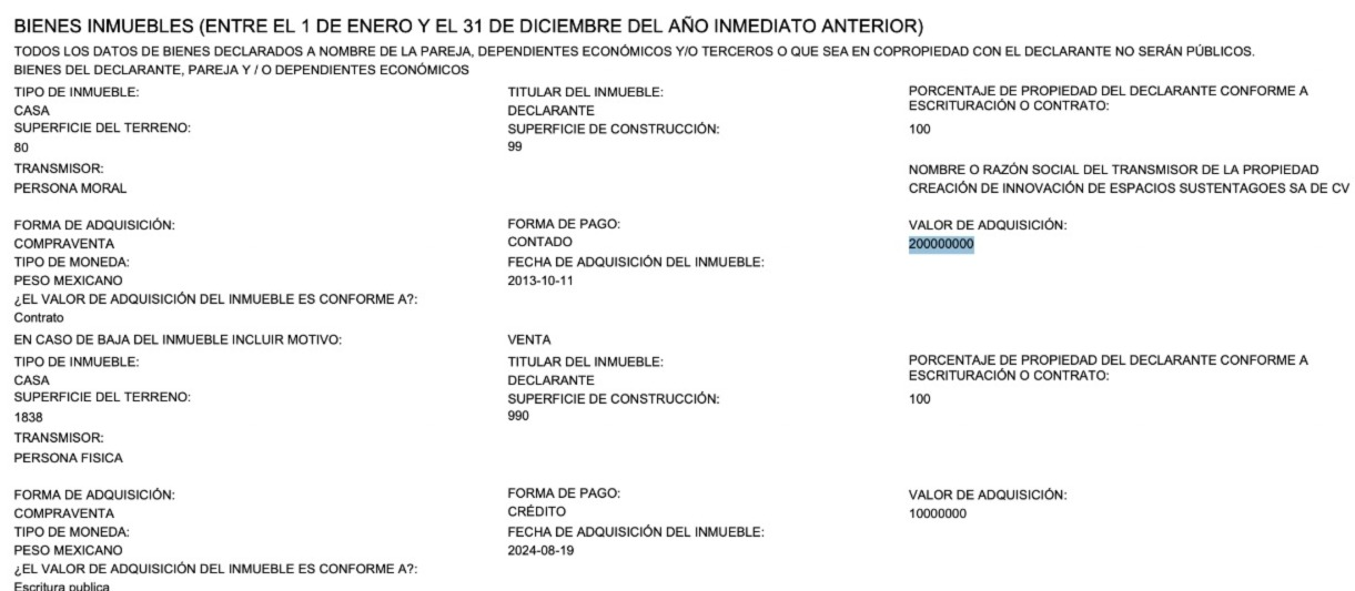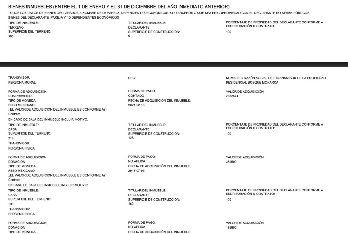 Sin embargo, en 2021, pagó de contado un inmueble con un valor de 2 millones 362 mil 574 pesos, adquirido por compraventa.