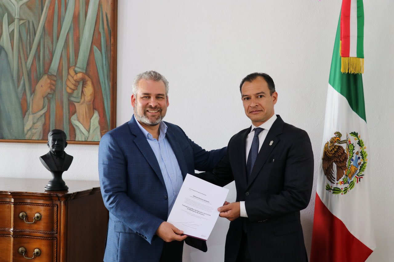Alfredo Ramírez Bedolla con su consejero jurídico, César Augusto Ocegueda.