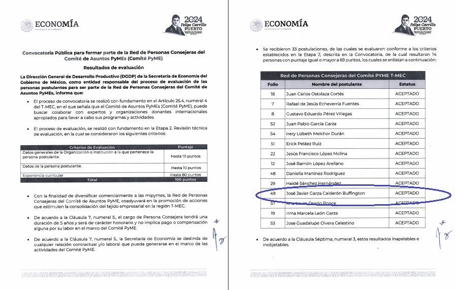 El 30 de abril de 2024, José Javier Garza Calderón Buffington fue integrado como uno de los 14 consejeros del gobierno mexicano en el Comité de Asuntos Pymes (pequeñas y medianas empresas) del T-MEC.