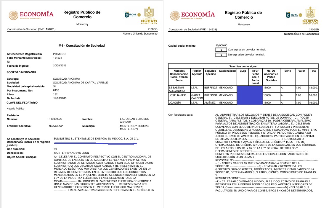 De acuerdo con su acta constitutiva, Suministro Sustentable de Energía en México S.A. de C.V. (SUMEX) fue fundada el 20 de agosto de 2015, ante la fe del notario Oscar Elizondo Alonso, de la Ciudad de Monterrey, Nuevo León.