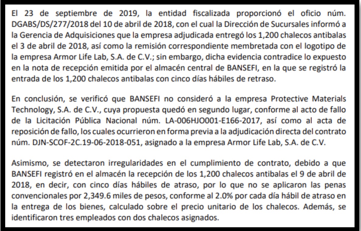 El grupo empresarial Indumil, que es encabezado a su vez por Gabriel Hernández Baca (que también aparece como CEO de Armoring Group), debía entregar en tres parcialidades divididas entre el 17 de septiembre, 17 de octubre y 17 de noviembre. Sin embargo, según información a la que tuvo acceso este medio de comunicación, se han identificado graves incumplimientos por parte de la empresa, pues por un lado, la empresa se ha atrasado en cada una de las entregas parciales y al día de hoy no ha llevado a cabo la entrega completa de las placas adquiridas, sin que se haya rescindido el contrato como marca la legislación en la materia; y por el otro, de acuerdo con pedimentos de importación registrados ante el SAT, las placas que sí fueron entregadas, fueron importadas por Armor Life Lab desde China, adquiridas de la empresa Hangzhou Bichi Imp & Exp Co.