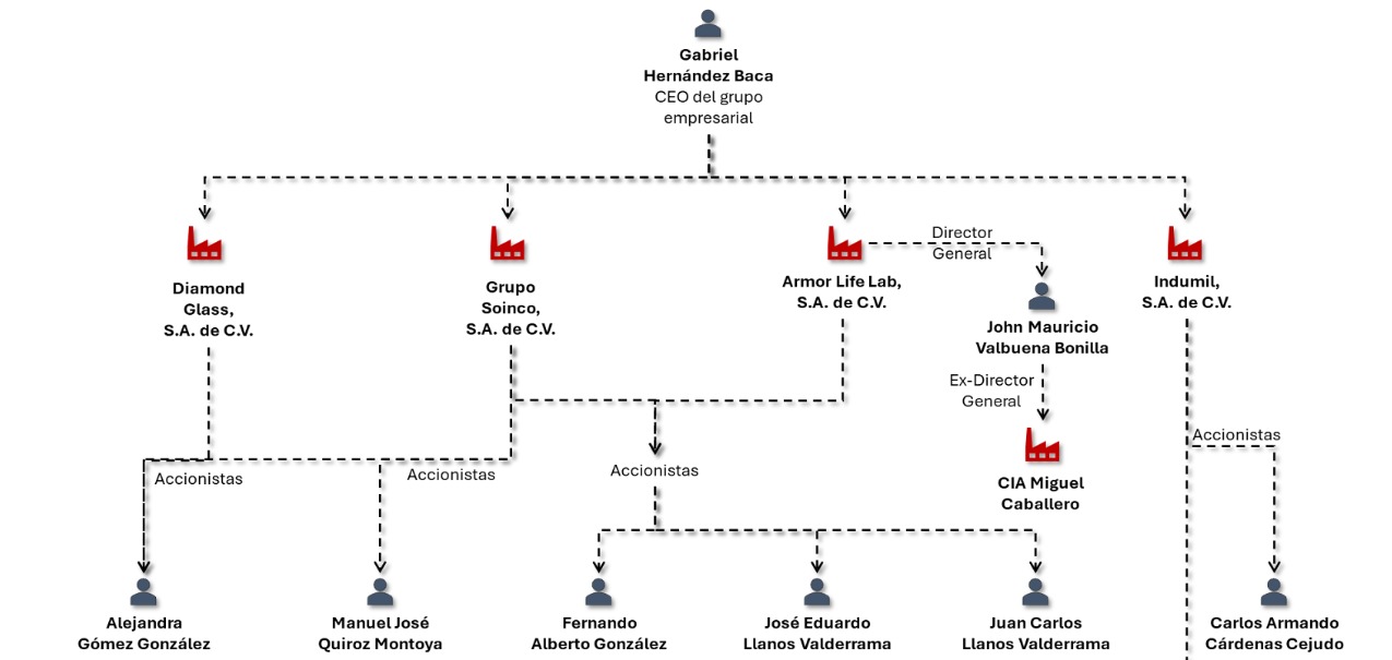 En México, firmas satélite del grupo como Armor Life Lab, Indumil SA de CV, Diamond Glass y Grupo Soinco han sido señaladas por prácticas similares: productos balísticos sin certificación, competencia simulada y contratos direccionados.