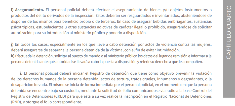 “El personal policial deberá iniciar el Registro de detención que tiene como objetivo prevenir la violación de los derechos humanos de la persona detenida, actos de tortura, tratos crueles, inhumanos y degradantes, o la desaparición forzada. El mismo se inicia de forma inmediata por el personal policial, en el momento en que la persona detenida se encuentre bajo su custodia, mediante la solicitud de folio comunicándose vía radio a la base Control del Registro de Detenciones (CRED) para que esta a su vez realice la inscripción en el Registro Nacional de Detenciones (RND), y otorgue el folio correspondiente”.
