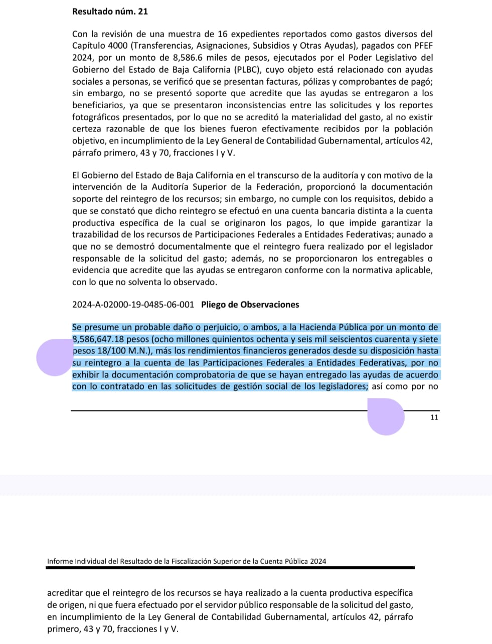 La auditoría 485 practicada al estado de Baja California por las Participaciones Federales a Entidades Federativas (PFEF) revela que 8 millones 586 mil 647.18 pesos fueron destinados a supuestas ayudas sociales por parte del Congreso local, pero sin que se acredite con documentación comprobatoria de que se entregaron realmente de acuerdo con lo contratado en las solicitudes de gestión social de los legisladores.