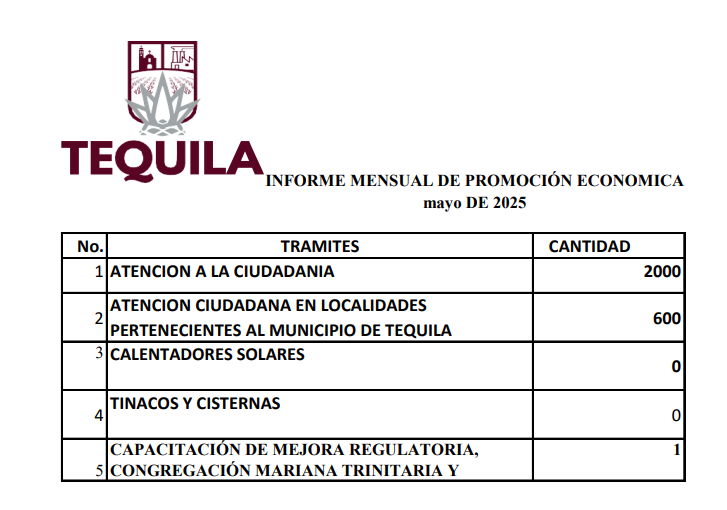 El ayuntamiento de Tequila también promovía un informe mensual con los logros en materia de promoción económica. En mayo de 2025, por ejemplo, citó haber dado 2 mil atenciones a la ciudadanía en esta materia. En un informe conjunto de abril, mayo y junio, afirmó haber dado 4600 servicios a la ciudadanía en este mismo rubro.