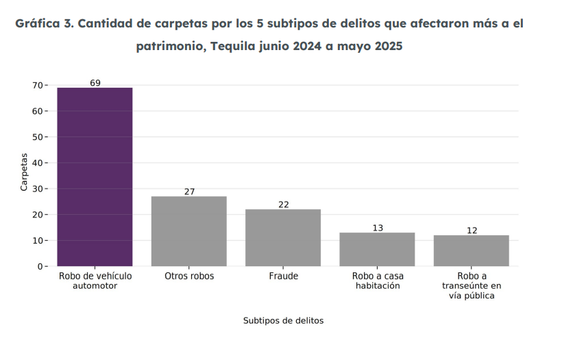 En otra gráfica, por cierto, se mostró que el 44.1% de los bienes afectados por delitos en Tequila eran inmuebles. En otra gráfica se muestran los delitos con mayor impacto, entre los cuales no figura la extorsión.