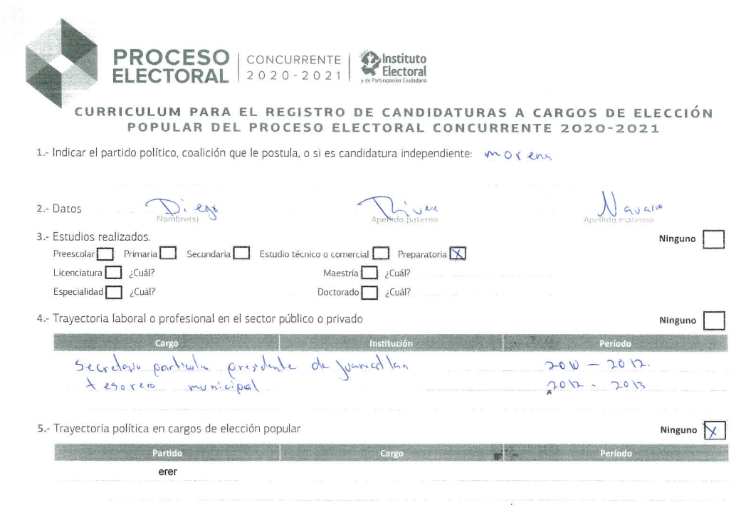 Antes de postularse como presidente municipal, Rivera Navarro fue regidor. Morena decidió avalar su candidatura pese a tener un currículum pobre que está disponible en los documentos electorales del registro de la candidatura a la regiduría.