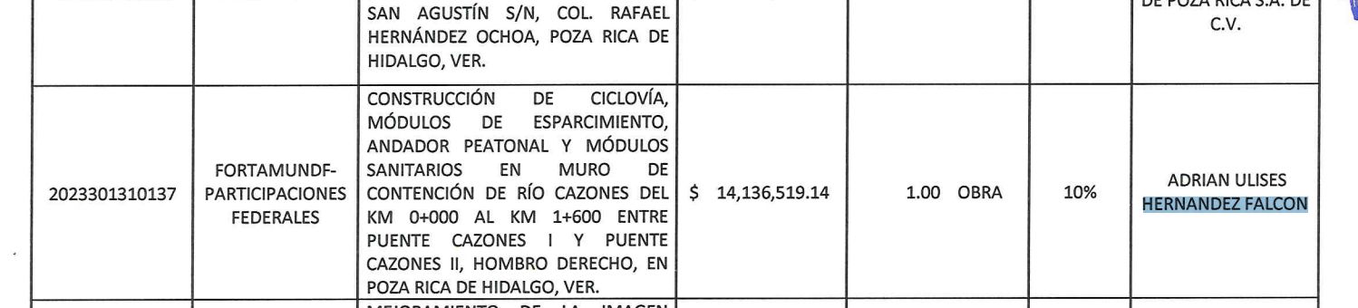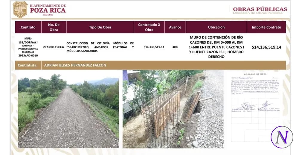La obra fue asignada al contratista de nombre Adrián Ulises Hernández Falcón, quien cobró un total de 14 millones 136 mil 519 pesos por realizar la obra “Muro de contención del Río Cazones del KM-0+000 al KM 1+600 entre Puente Cazones y Puente Cazones II, Hombro derecho”, de acuerdo al contrato 131/DOP/FORTAMUNDF-PARTICIPACIONESFEDERALES2023/AD-0010.