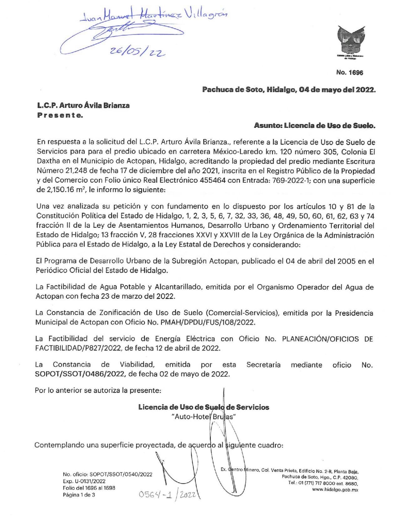 La misma presidencia de Actopan, entonces a cargo de la morenista Tatiana Ángeles Moreno, le otorgó la Constancia de Zonificación de Uso de Suelo (Comercial-Servicios) No. PMAH/DPDU/FUS/108/2022.