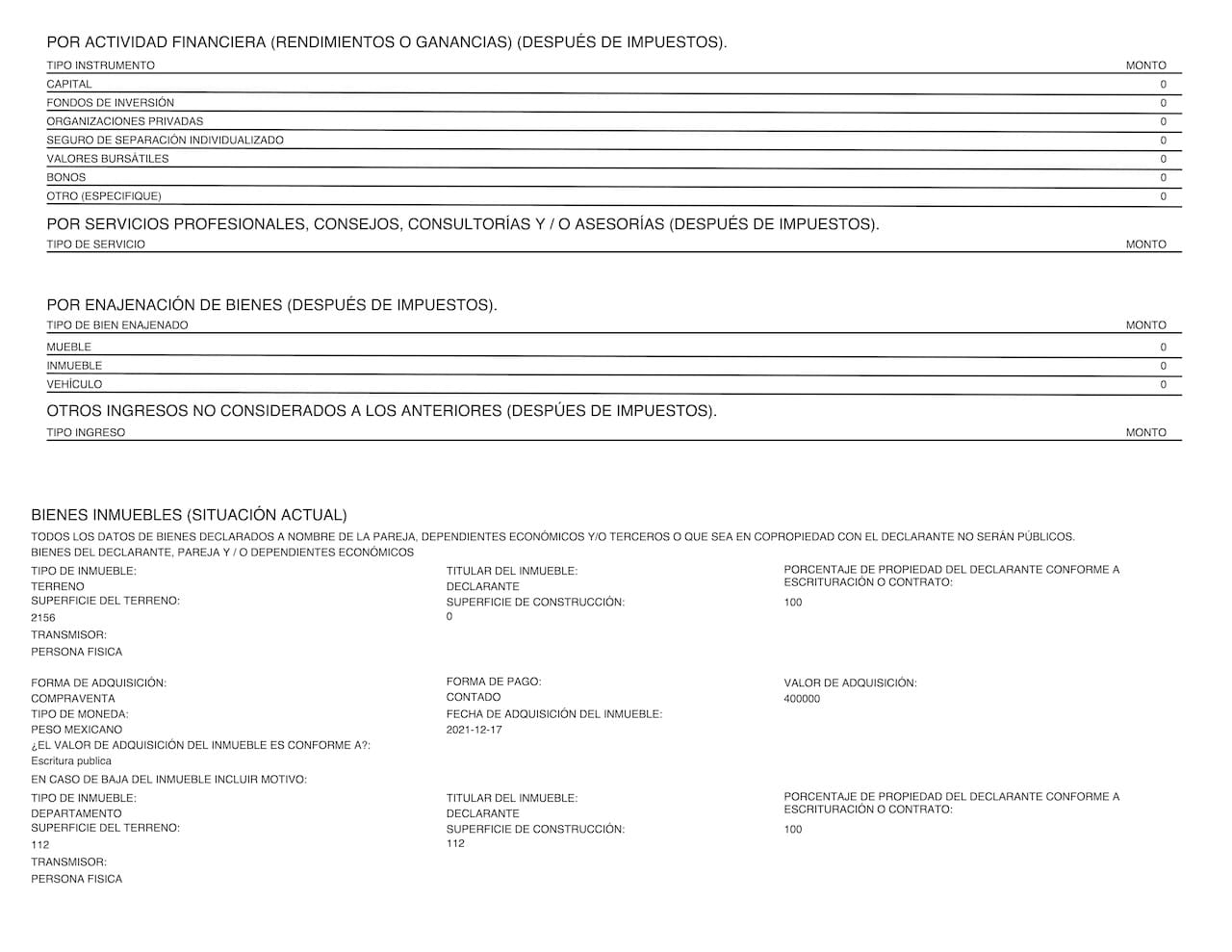 También dio cuenta de la compra de un terreno de 2 mil 156 metros cuadrados, al contado, en una transacción por 400 mil pesos, efectiva el 17 de diciembre de 2021.