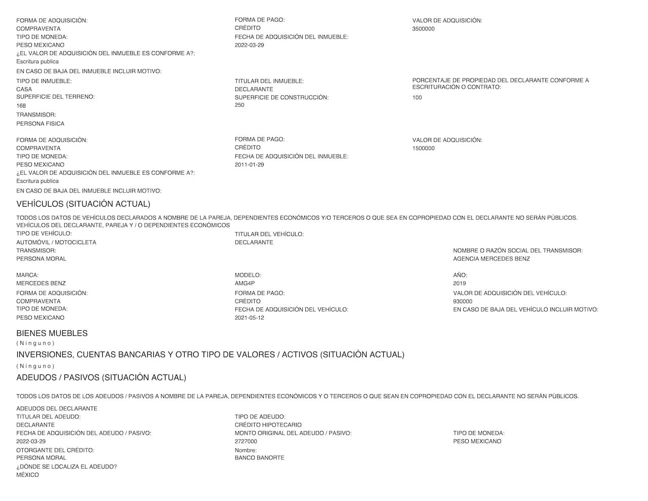 Además, en el intervalo entre sus dos últimas declaraciones; es decir, entre marzo y octubre de 2022, el integrante del grupo político de Omar Fayad se hizo de un departamento de 3.5 millones de pesos, a través de un crédito efectivo el 29 de marzo. Es un inmueble de 112 metros cuadrados tanto de terreno como de construcción.