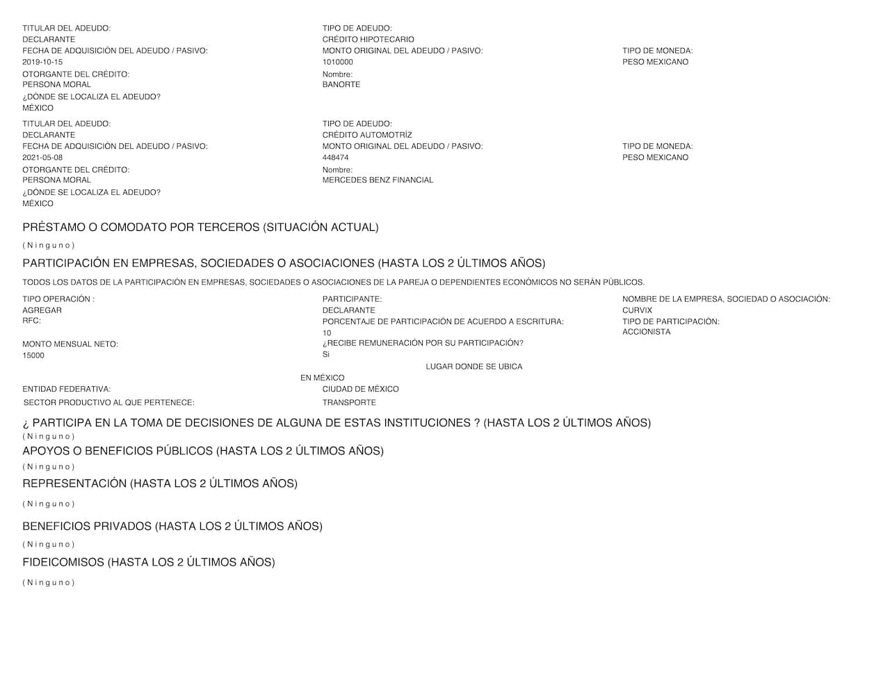 Asimismo, aseveró que no contaba con ninguna propiedad y que, además de la participación accionaria en el transporte urbano de la Ciudad de México, no tenía otra fuente de ingresos más que su salario como subsecretario, que entre el primero de enero y el 31 de diciembre del año previo, 2020, le había dejado 677 mil 186 pesos.
