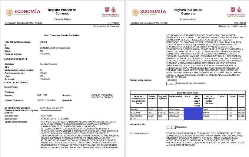 De acuerdo con una investigación de EMEEQUIS sobre dicha estructura financiera, los hermanos Neme Aziz y Joaquín Leal montaron en 2013 la empresa Lenergia S.A. de C.V., para la construcción de plantas y parques de generación de energía eléctrica o eólica, así como para la comercialización de electricidad.
