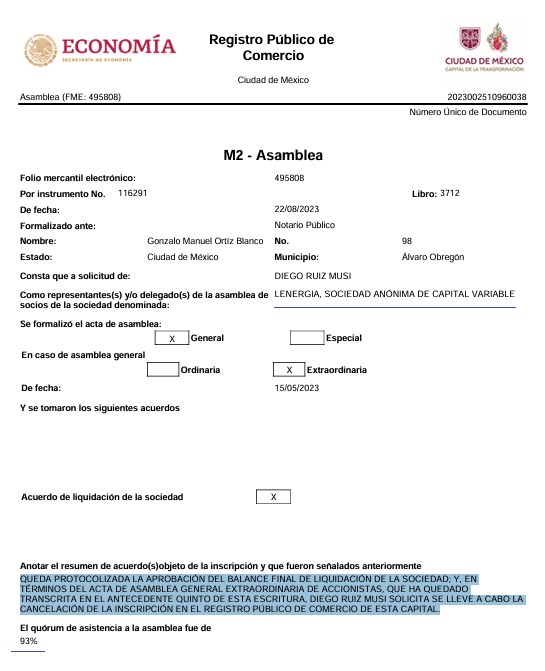 El 15 de mayo de 2023, con presencia de Joaquín Leal Jiménez, de Salvador Neme Aziz y del liquidador, quedó “protocolizada la aprobación del balance final de liquidación de la sociedad; y, en términos del acta de asamblea general extraordinaria de accionistas, que ha quedado transcrita en el antecedente quinto de esta escritura, Diego Ruiz Musi solicita se lleve a cabo la cancelación de la inscripción en el registro público de comercio de esta capital”.