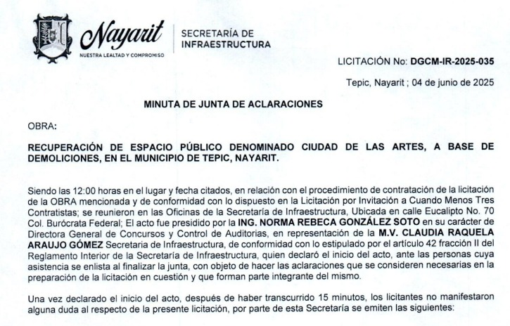 Según el documento de licitación, que es público, el 4 de junio se llamó a las empresas participantes a presentar documentación para el concurso por la obra. El documento fue llamado “RECUPERACIÓN DE ESPACIO PÚBLICO DENOMINADO CIUDAD DE LAS ARTES, A BASE DE DEMOLICIONES, EN EL MUNICIPIO DE TEPIC, NAYARIT”. Fue emitido por la Secretaría de Infraestructura del estado, encabezada por Claudia Raquela Araujo.