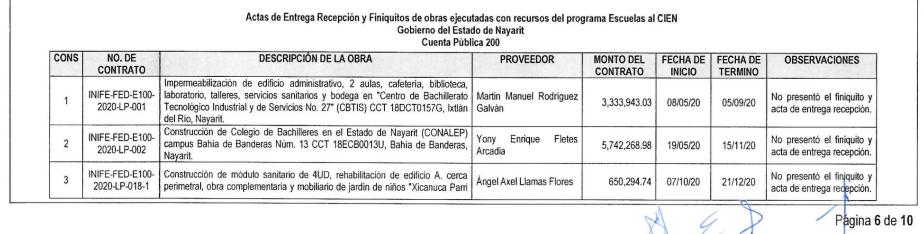 Una cosa que llama la atención es la auditoría realizada por la ASF y publicada el 27 de abril de 2021 en la que se menciona un contrato por 650 mil 294 pesos para la empresa de Llamas Flores. En la auditoría se señala que la empresa no presentó el finiquito y el acta de entrega recepción por la construcción de un módulo sanitario realizado con el programa Escuelas al CIEN del gobierno de Nayarit. Estos documentos certifican que la obra fue entregada.