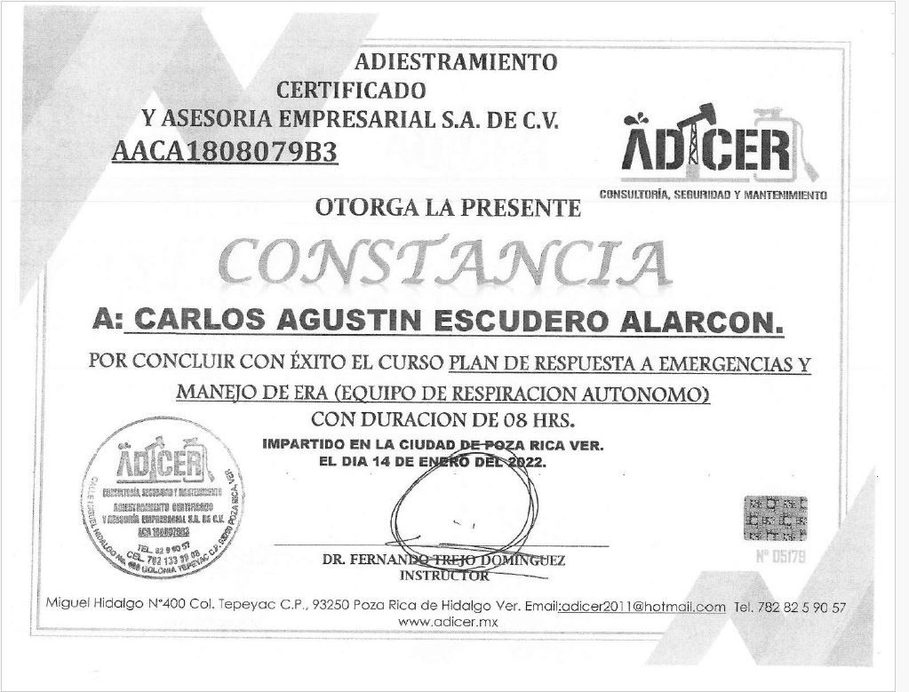 También cuenta con una constancia emitida por el Departamento de Contraincendio de Pemex Exploración y Producción, Poza Rica, por el curso “Uso y manejo de materiales peligrosos”, de 40 horas. En la misma dependencia acreditó los cursos de “Brigadas contra incendios”, “Brigadas de primeros auxilios” y “Brigada de rescate industrial”, con la misma duración.