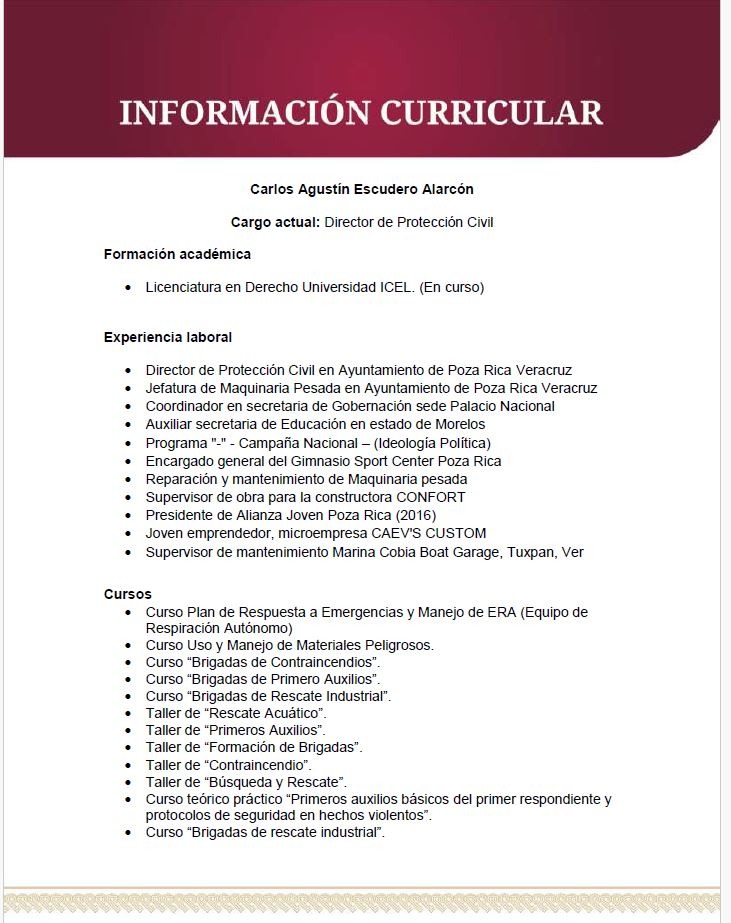 EMEEQUIS.- El director de Protección Civil en Poza Rica, Veracruz, Carlos Agustín Escudero Alarcón, es estudiante de derecho y, de acuerdo con la Plataforma Nacional de Transparencia, su nivel máximo de estudios comprobables es el bachillerato.