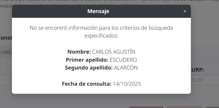 EMEEQUIS también revisó el Registro Nacional de Profesiones y la plataforma arrojó que no hay registro de Carlos Agustín Escudero Alarcón.