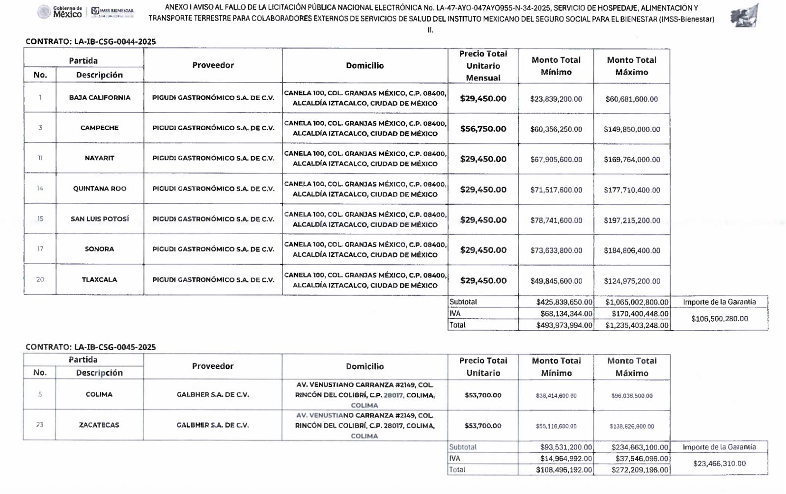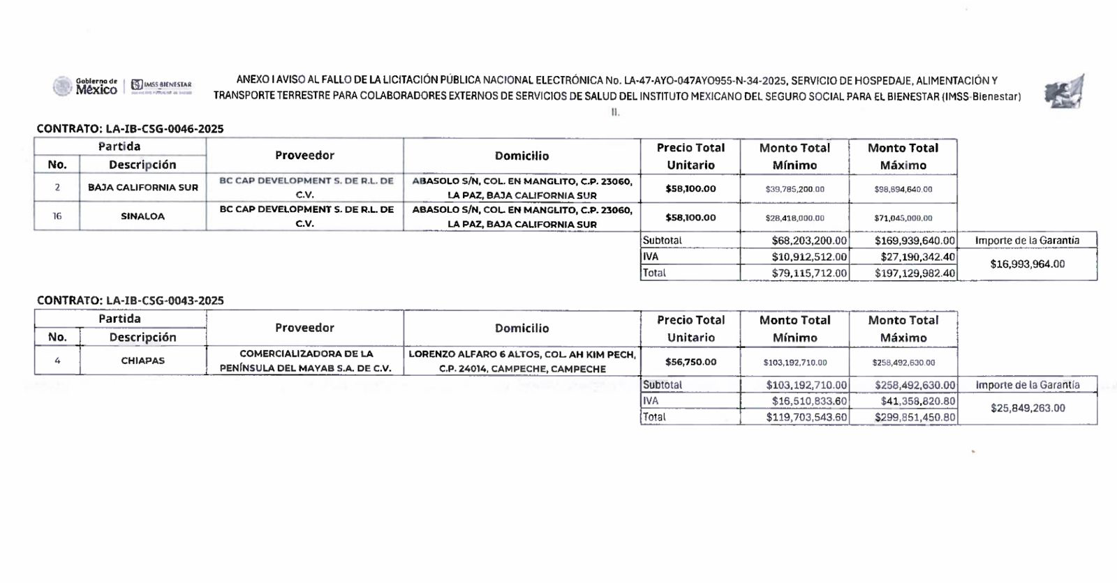 - Galbher S.A. de C.V. (Contrato LA-IB-CSG-0045-2025): Registra un monto máximo total de $272,209,196.00 MXN y una garantía de $23,466,310.00 MXN.