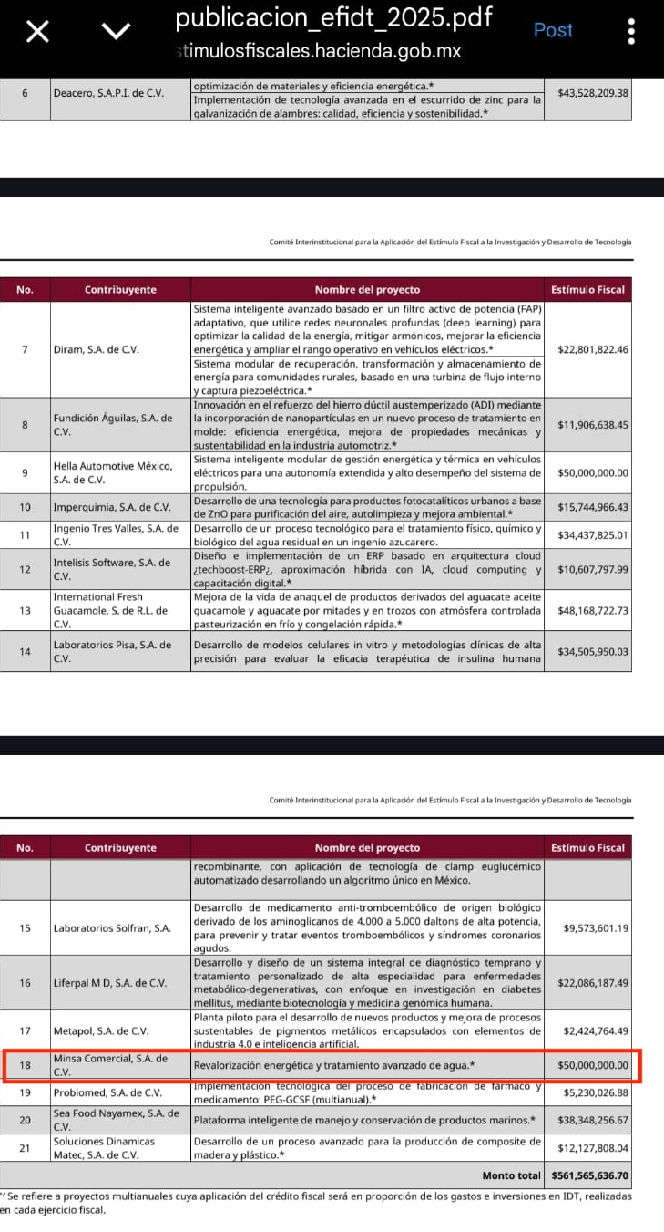 El Comité Interinstitucional para la Aplicación del Estímulo Fiscal a la Investigación y Desarrollo de Tecnología autorizó un monto total de $561,565,636.70 M.N. (Quinientos sesenta y un millones quinientos sesenta y cinco mil seiscientos treinta y seis pesos 70/100 M.N.) para el ejercicio fiscal 2025, siendo Minsa Comercial de las que más recibió ya que fue acreedora al tope máximo de 50 millones de pesos.