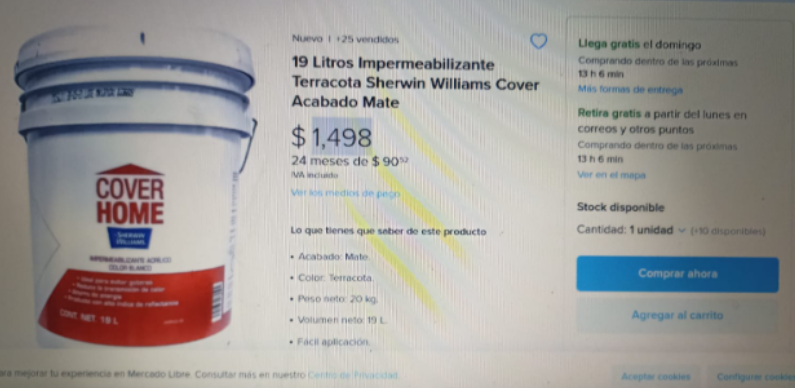 El precio en MercadoLibre de “19 Litros Impermeabilizante Terracota Sherwin Williams Cover Acabado Mate” es de 1,498 pesos.