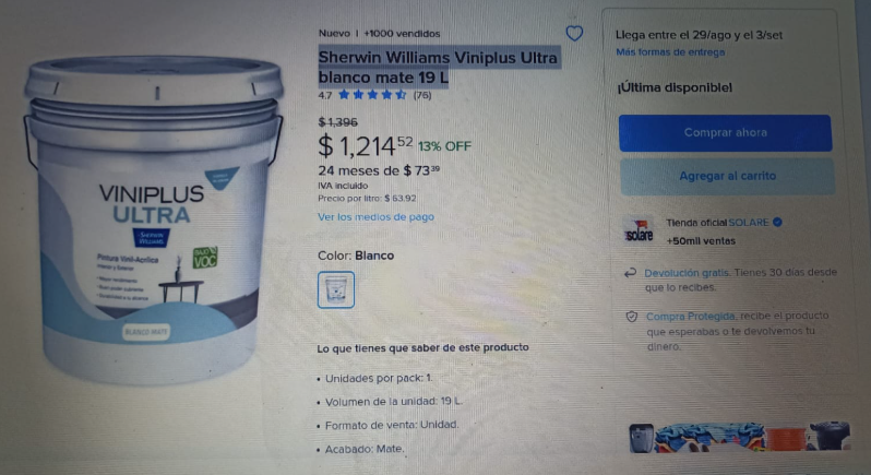 En MercadoLibre la pintura “Sherwin Williams Viniplus Ultra blanco mate 19 L” tiene un precio de 1,214.52 pesos. Y en Uber Eats/Soriana “Sherwin Williams · Pintura vinílica blanca (19 L)” tiene un costo de 1,599 pesos.