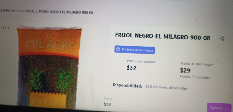 Lo mismo que el “frijol negro marca Milagro 900 gr” se acordó un precio de 46.50 pesos, rn la comercializadora el Renacer Fénix tiene un precio de 32 pesos al menudeo y 29 pesos al mayoreo a partir de tres piezas. Se pagaron 17.50 pesos más por cada bolsa, un sobreprecio del 60 por ciento, un total de 3 mil 500 pesos más.