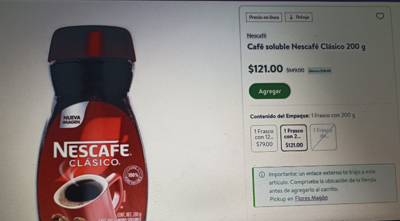 Se acordó el precio del “café soluble de 200 G marca Nescafé en 221.93 pesos”, este producto tiene un costo en la tienda Aurrerá de 121 pesos, es decir, 100.93 pesos de más, un sobreprecio de 83 por ciento. Aquí el sobreprecio representó 20 mil 186 pesos más.