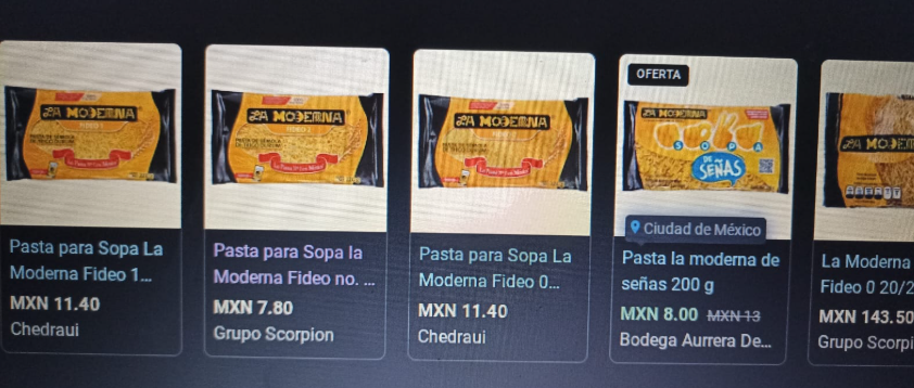 También se solicitaron “dos bolsas de sopa indistinta de 200 gr marca Moderna” en 33 pesos por unidad, es decir, 66 pesos, y una bolsa de sopa La Moderna en Chedraui tiene un costo de 11.40 pesos, un total de 22.80 pesos por las dos unidades, por lo que la Secretaría de bienestar pagó 43.20 pesos, 189 por ciento más, 8 mil 640 pesos de sobre costo.