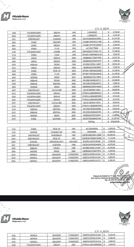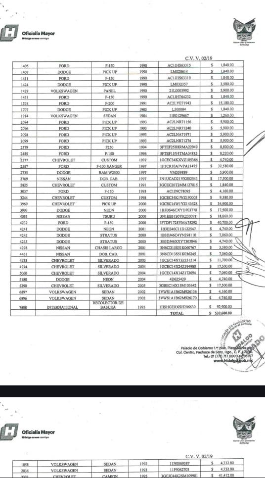 El primer lote fue de 48 vehículos. El de menor valor, un Volkswagen Sedán 1984, antes identificado con el número 1914 en el inventario de bienes del Poder Ejecutivo, en tanto que camionetas como Ford 150 y Dodge Pick Up 1990, al igual que una Chevrolet Custom 1991, fueron vendidas en mil 840 pesos cada una. Sólo en el primer lote hubo seis camionetas con ese precio.