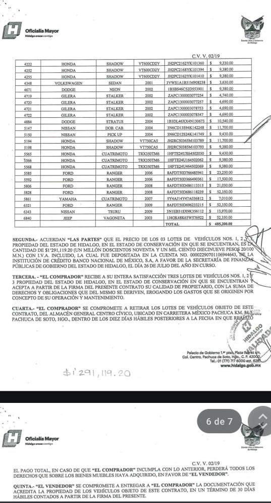 Las cláusulas del contrato establecen que los 112 vehículos adquiridos deberían ser retirados del almacén general Centro Cívico, ubicado en la carretera México-Pachuca, kilómetro 84.5, en los 10 días siguientes al pago.