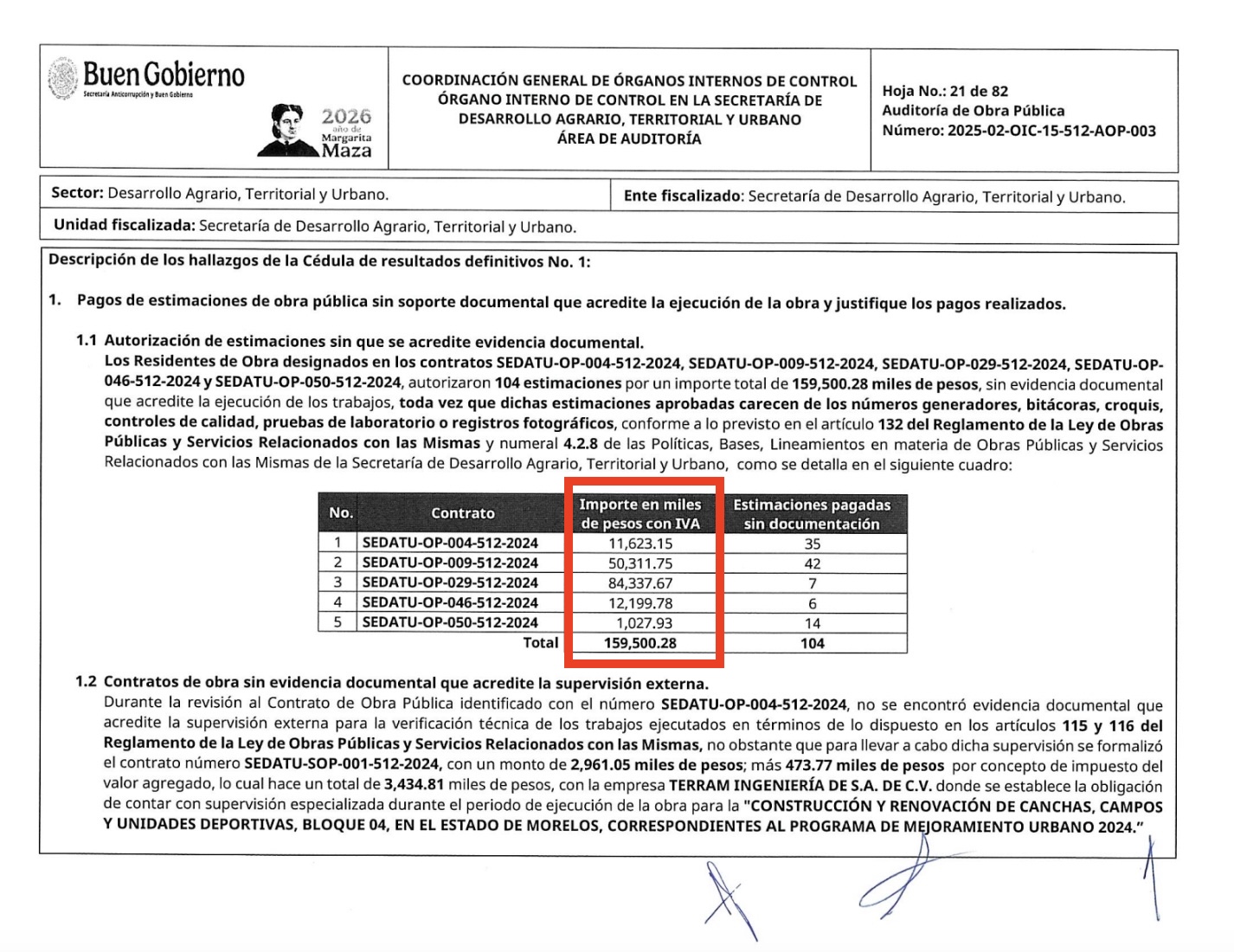 “Los residentes de obra designados en los contratos SEDATU-OP-004-512-2024, SEDATU-OP-009-512-2024, SEDATU-OP-029-512-2024, SEDATU-OP-046-512-2024 y SEDATU-OP-050-512-2024 autorizaron 104 estimaciones por un importe total de 159,500.28 miles de pesos (159 millones 500 mil 280 de pesos), sin evidencia documental que acredite la ejecución de los trabajos, toda vez que dichas estimaciones aprobadas carecen de números generadores, bitácoras, croquis, controles de calidad, pruebas de laboratorio o registros fotográficos”, admite la propia SEDATU en una auditoría interna.
