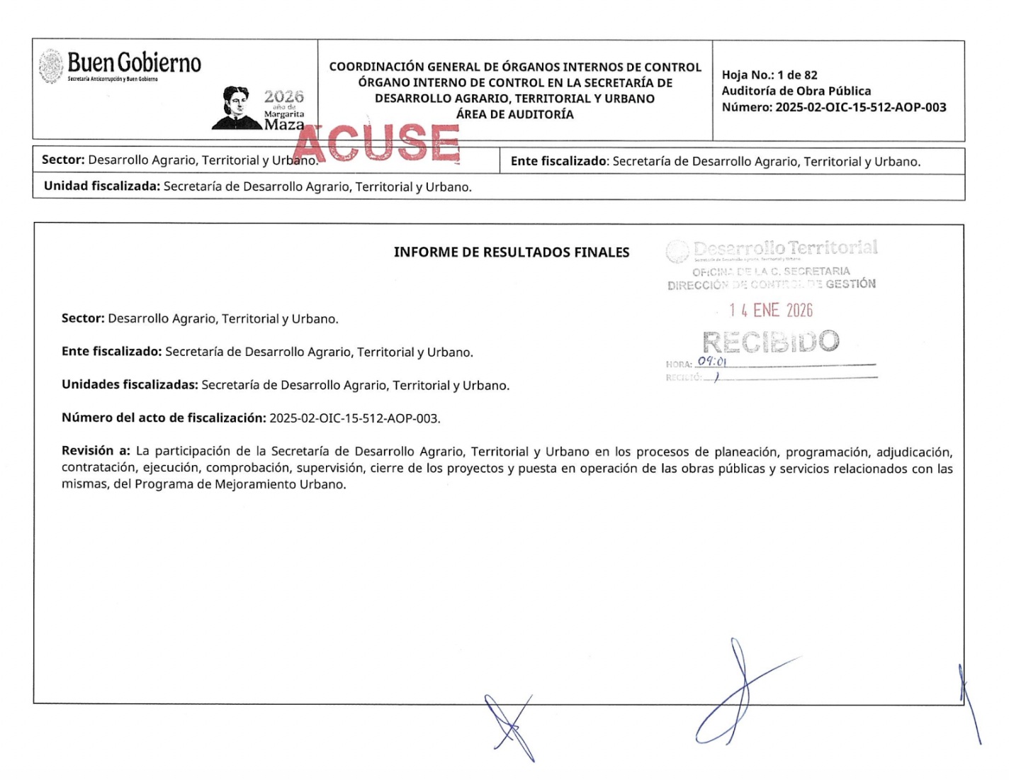 EMEEQUIS tiene en su poder una auditoría interna con acuse de recibo del 14 de enero de 2026 que revela que la SEDATU pagó 159.5 millones de pesos a empresas constructoras y supervisoras de obras sin que hasta el momento existan documentos que acrediten la realización de las supuestas estimaciones supuestamente realizadas en 2024.