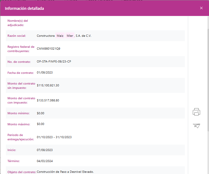 Según los registros visibles de estas dos fuentes, con el número de expediente O-STA-FIMFE-09/23-CP, sólo hubo un oferente o concursante (con el registro de proveedor 166395453) y el mismo asistente a la junta de aclaraciones. El contrato se suscribió el 7 de septiembre siguiente por 133 millones 517 mil pesos, y concluyó su vigencia el 4 de marzo de 2024.