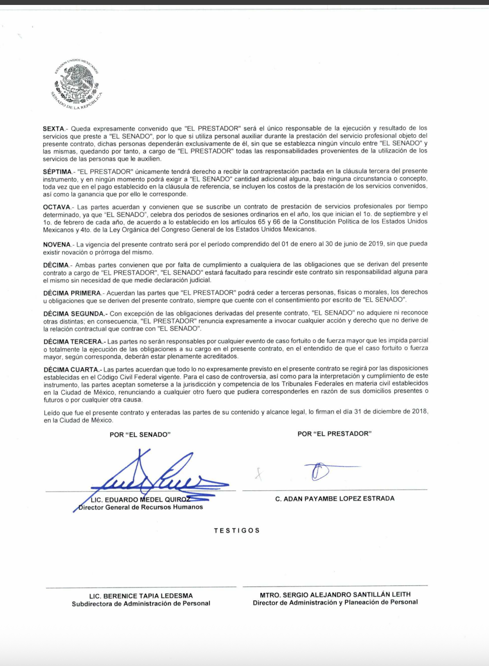 Adán Payambé López Estrada, hijo del extitular de la Secretaría de Gobernación (Segob) y actual senador, Adán Augusto López Hernández, fue contratado por el Senado de la República por honorarios y por tiempo indefinido en el año 2018.