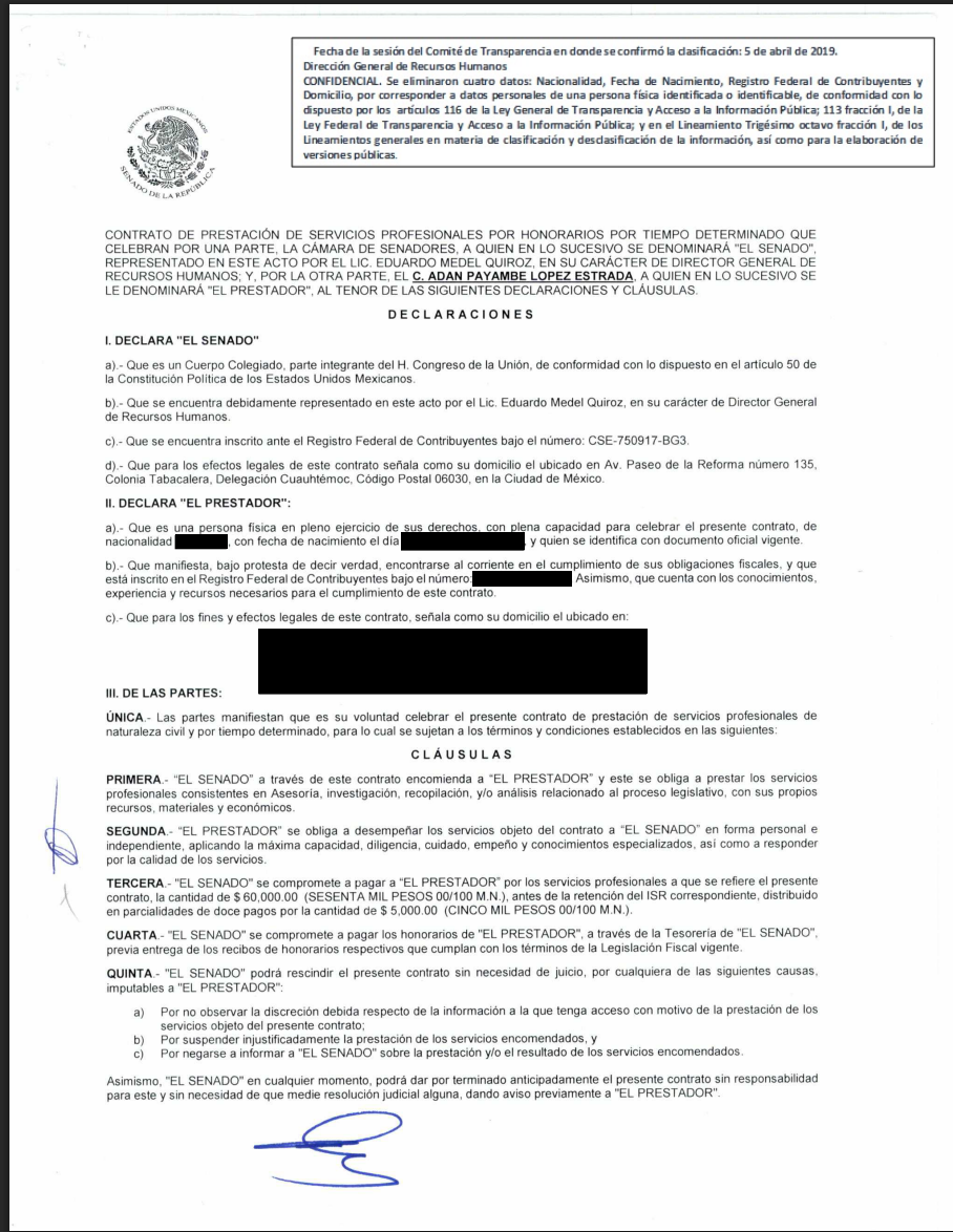 El objeto del contrato era investigación, recopilación y análisis del proceso legislativo y fue formalizado en diciembre de 2018, durante el gobierno de Andrés Manuel López Obrador y cuando su papá se desempeñaba como gobernador de Tabasco. Por parte del Senado lo firmó Eduardo Medel Quiroz, director general de Recursos Humanos.