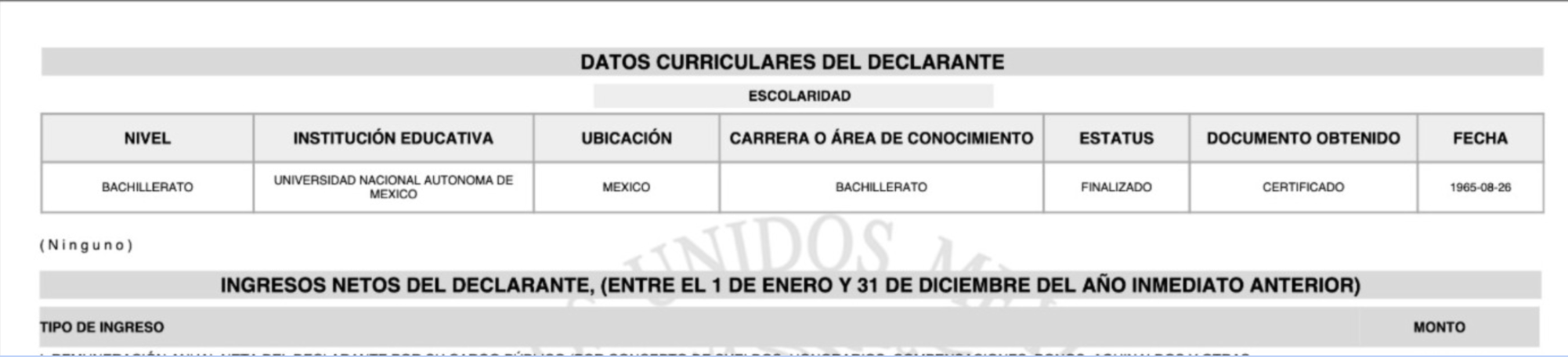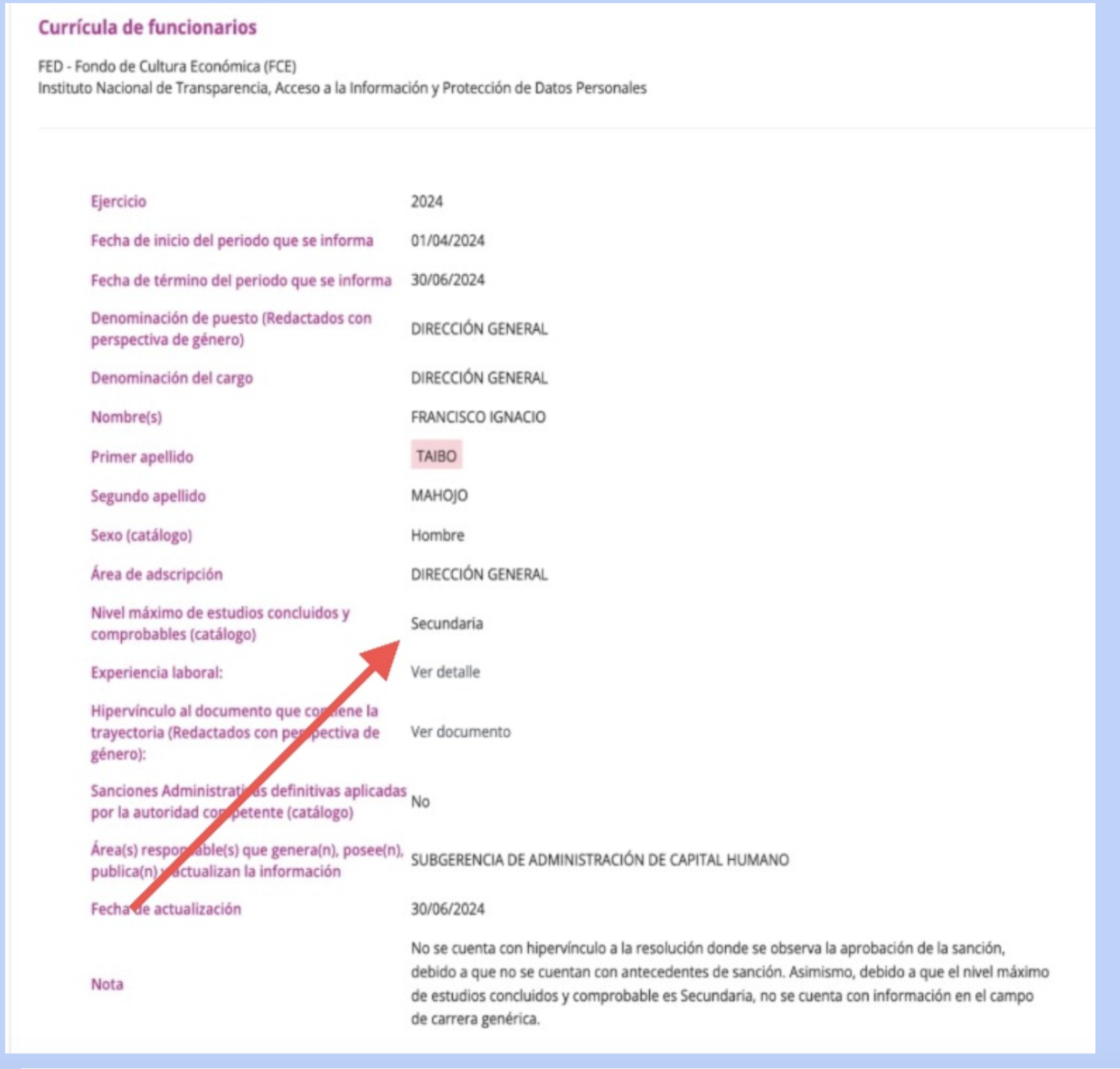 Asimismo, en la currícula de funcionarios del FCE, no se encuentra su CV para poder cotejar su trayectoria, como se haría con cualquier otro funcionario público. Aunque en la tarjeta informativa de transparencia se muestra que sólo tiene registrados estudios hasta nivel secundaria: