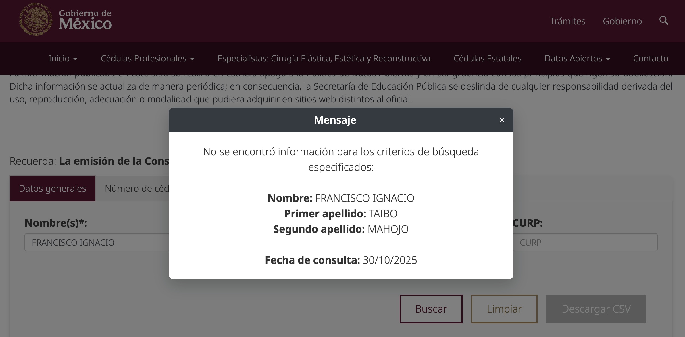 Para cotejar esta información, EMEEQUIS buscó la cédula profesional de Paco Ignacio Taibo II en el registro federal de profesionistas, sin que arrojara resultados.