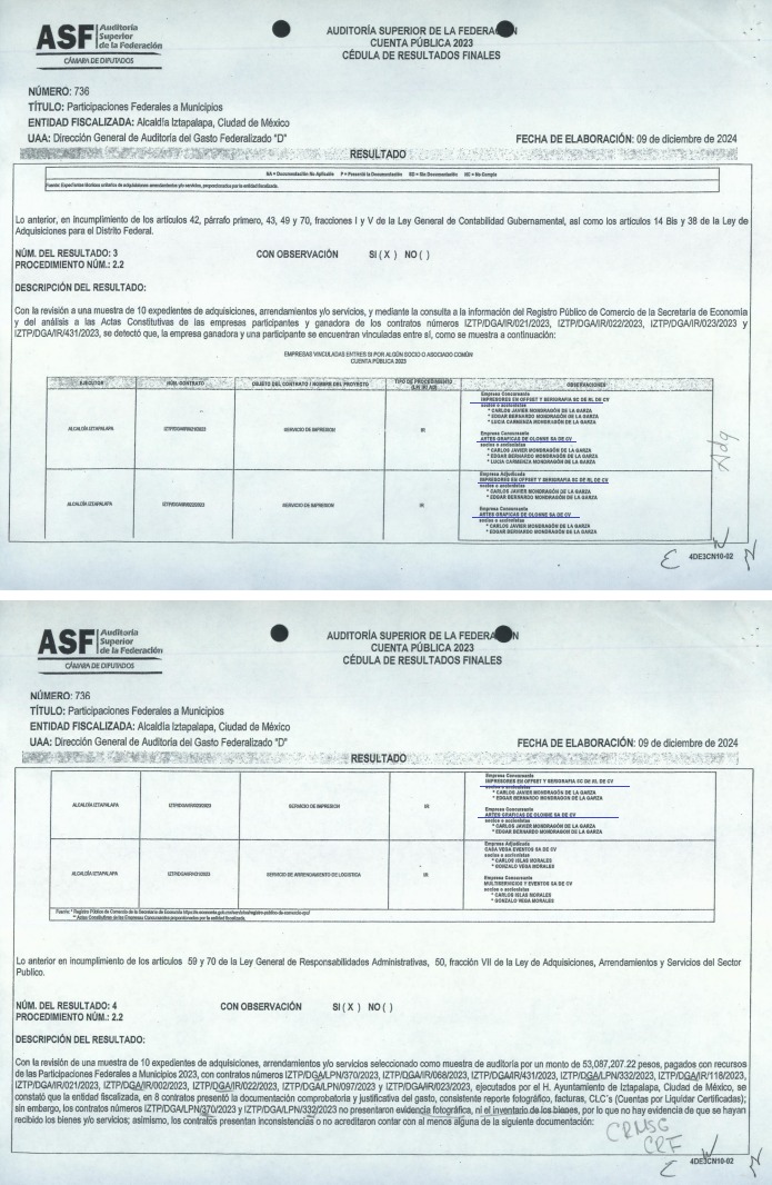 Se trata de los procedimientos para asignar los contratos IZTP/DGA/IR/021/2023, por 4 millones 999 mil 924 pesos; y IZTP/DGA/IR/022/2023, por 3 millones 997 mil 615 pesos; y IZTP/DGA/IR/023/2023, por 999 mil 192 pesos, por los que “compitieron” Impresores en Offset y Serigrafía y Artes Gráficas de Olonne, de los mismos dueños: Carlos Javier Mondragón de la Garza, Edgar Bernardo Mondragón de la Garza y Lucía Carmenza Mondragón de la Garza.
