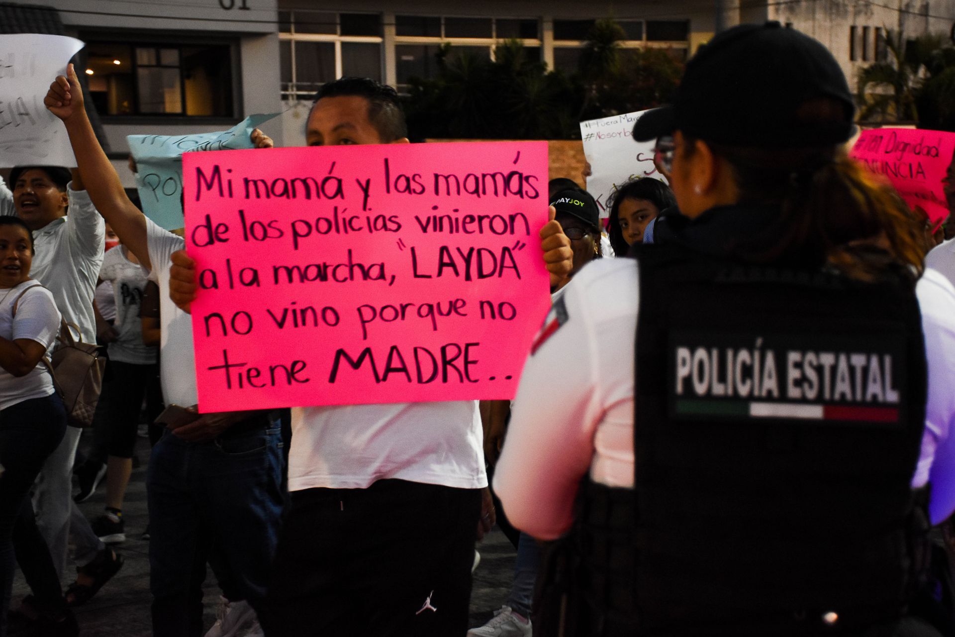 El contingente de manifestantes es dispersado a tiros por los cuerpos policíacos, en la plaza central de Cancún. La movilización fue convocada para exigir justicia por el asesinato de Bianca Alejandrina “Alexis”.
