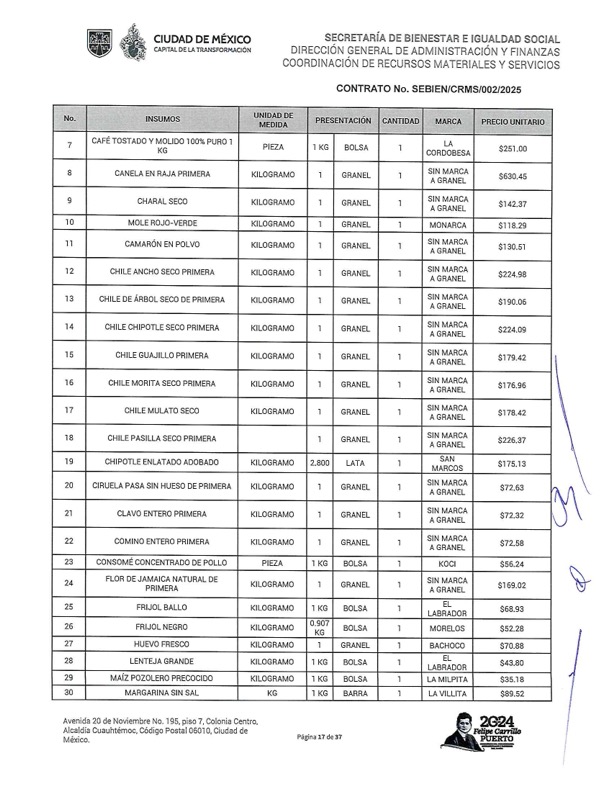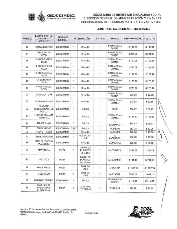Entre los contratos que también contienen sobre precios, un ejemplo es el SEBIEN/CRMS/002/2025Se en el que se solicitó una mayonesa McCormick de 3.4 kilos. Pagaron 367.76 y en las tiendas Sam’s Club tiene un precio de 295.64 pesos. El frijol bayo marca El Labrador de un kilo por el cual se pagaron 69.93 y que tiene un costo de 47.50 pesos en distribuidora de abarrotes La Valenciana.