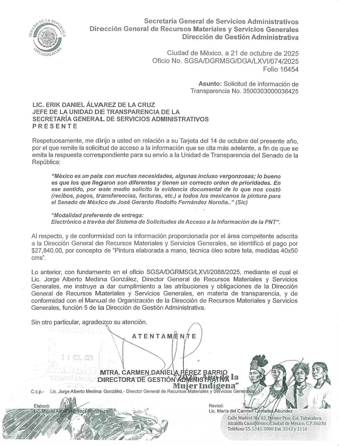 EMEEQUIS.– El Senado de la República desembolsó $27,840.00 pesos de recursos públicos para la adquisición de una pintura al óleo del senador Gerardo Fernández Noroña, según reveló una respuesta oficial a una solicitud de transparencia presentada ante la Cámara Alta.