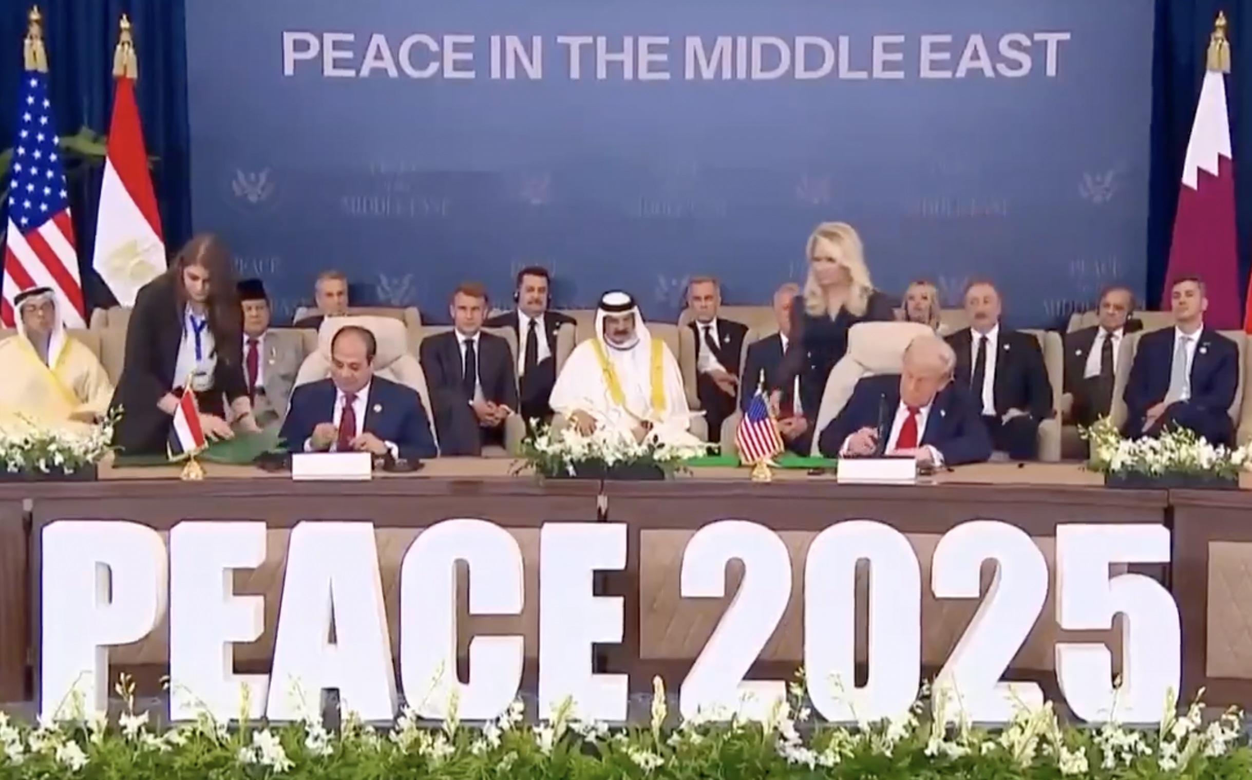 "Juntos, hemos logrado lo que todos creían imposible. Por fin, tenemos PAZ en Oriente Medio”, dice Donald Trump al estampar su firma.