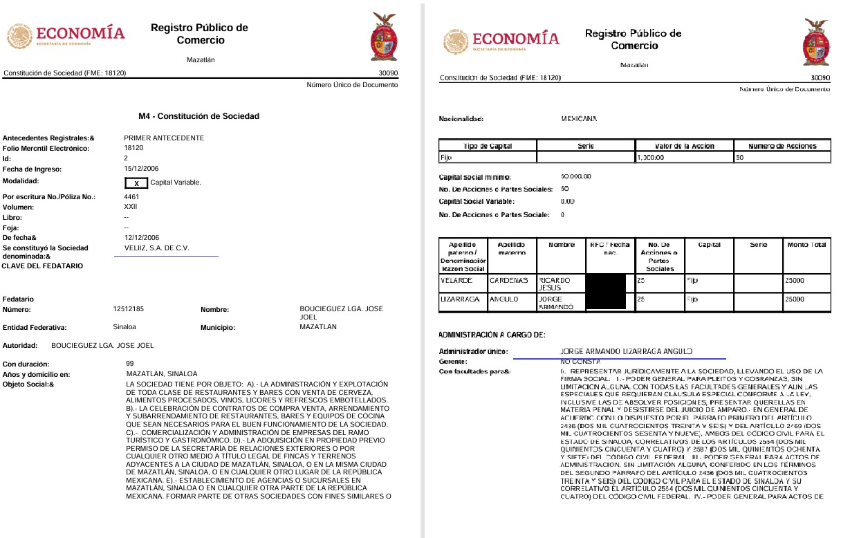 En marzo de 2009, Ricardo Velarde y Jorge Armando Lizárraga crearon en Mazatlán otra empresa, Operadora de Bares Veliz S.A. de C.V., con propósitos semejantes a la anterior.