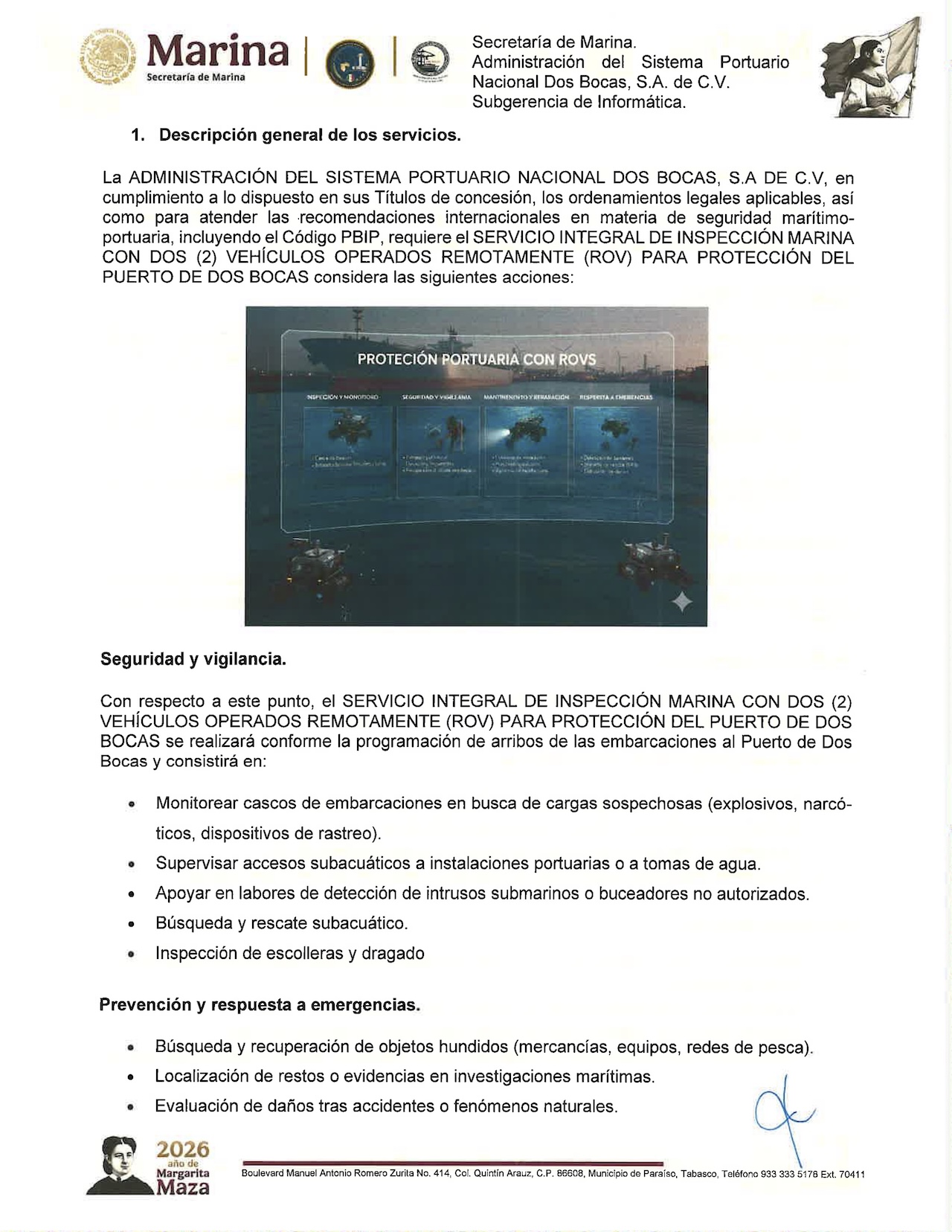 El Puerto de Dos Bocas reconoce que enfrenta “un conjunto de riesgos crecientes” como amenazas subacuáticas, sabotaje, contrabando sumergido, manipulación no autorizada de infraestructura crítica, deterioro estructural no identificado y fugas de combustible, por lo que requiere el servicio de inspección Marina con vehículos operados remotamente, robots submarinos.