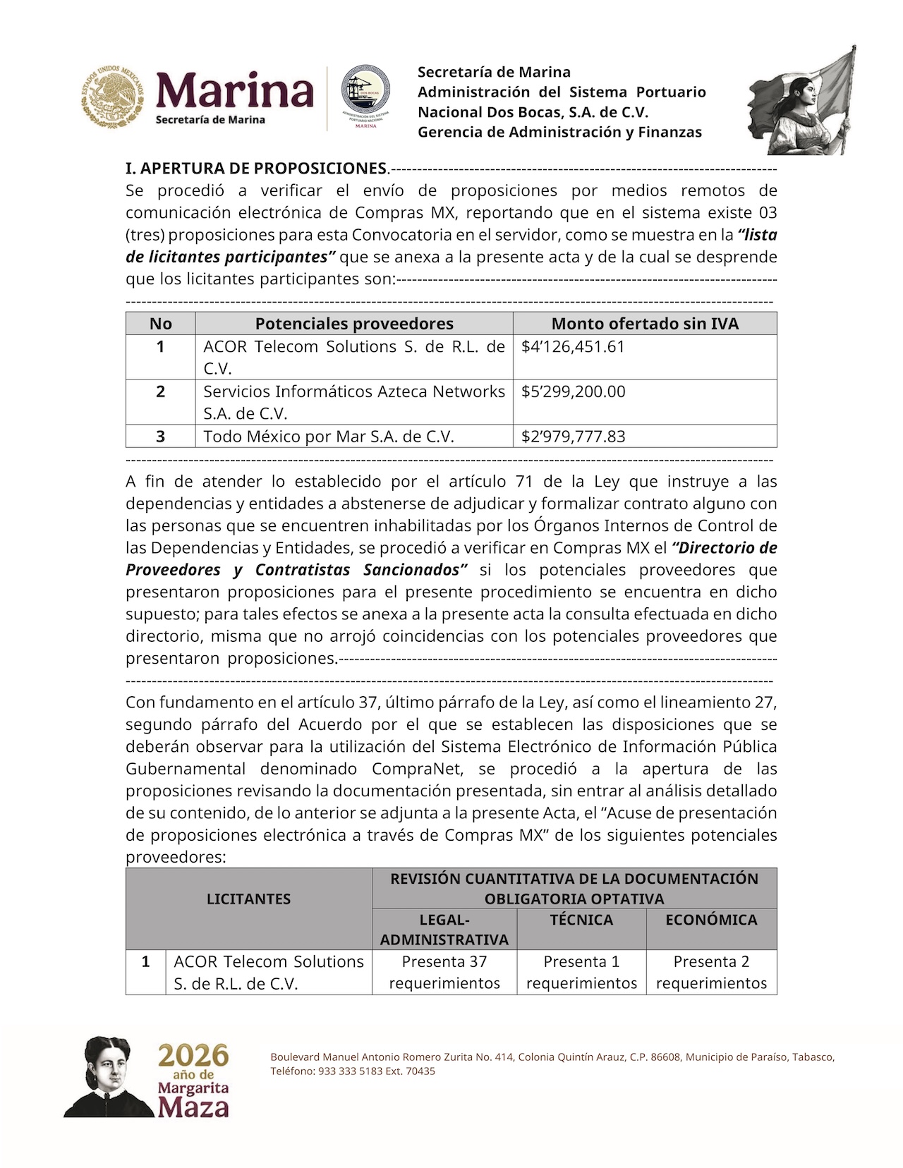 Empresas presentaron propuestas de 3.5 a 6.1 millones de pesos por dos vehículos operados remotamente para protección del Puerto de Dos Bocas para el periodo de ocho meses en lo que resta de 2026.