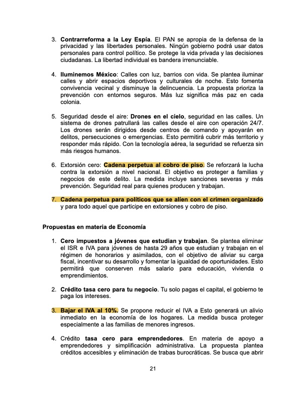 El PAN propone cero impuestos a jóvenes que estudian y trabajan (hasta los 29 años); bajar el IVA al 10 %; créditos a tasa cero para negocios y emprendedores; incentivos al primer empleo joven; reducir a la mitad el IEPS a gasolinas y exentar de ISR los aguinaldos.
