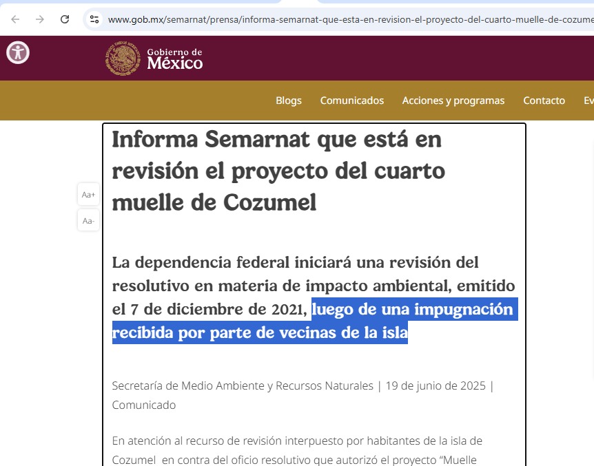 Y aunque no “revocó” la MIA ―algo que por lo demás entraría en problemas jurídicos―, Bárcena dio entrada a “la impugnación de vecinas de la isla”. El pasado 19 de junio, declaró una “revisión del resolutivo en materia de impacto ambiental” al proyecto.