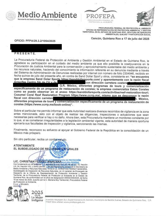 Hechos denunciados: “Presunta comercialización en medios digitales, eventos públicos y establecimientos comerciales, de especies enlistadas en la NOM-059, pues se ha detectado la oferta y movilización de especies de fauna marina (posiblemente coralina o derivada de ecosistemas arrecifales) incluidas en la NOM-059-SEMARNAT-2010; No se ha acreditado la existencia de autorizaciones CITES ni permisos de aprovechamiento sustentable; Ejecución de actividades técnico-científicas sobre corales sin MIA: acciones como fragmentación, trasplante, cultivo ex situ e instalación de estructuras en arrecifes para manipulación de corales. Todo lo anterior se realiza sin constancia de evaluación ambiental ni autorización por parte de SEMARNAT, lo cual constituye una violación grave al procedimiento ambiental”.